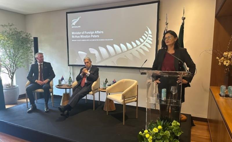 (Stephen Blair, Diretor Regional da New Zealand Trade & Enterprise para América Latina; Winston Peters, Ministro de Relações Exteriores da Nova Zelândia; e Tatiana Prazeres, Secretária de Comércio Exterior do Ministério do Desenvolvimento, Indústria e Comércio. Imagem: Agência Galo)